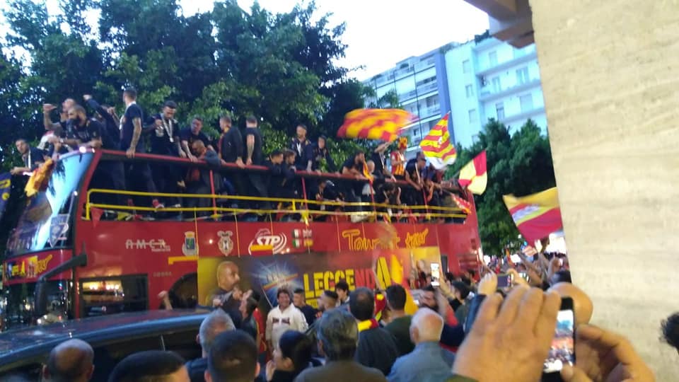 LECCE – Bagno di folla, gioia incontenibile, tripudio giallorosso in centro a Lecce, si festeggia la serie A e la squadra di mister Liverani a bordo del pullman scoperto percorre Piazza Mazzini, e si fa abbracciare dai suoi tifosi; non passa da Piazza Sant’Oronzo ma prosegue verso la strada della Prefettura e cioè via XXV Luglio.