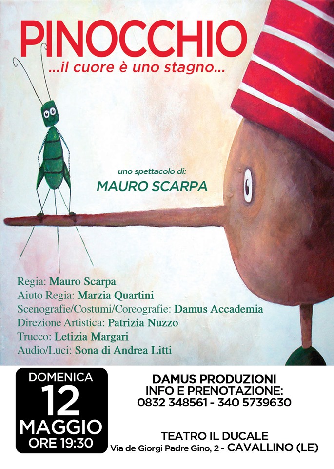CAVALLINO-  Il romanzo di Claudio Collodi torna in scena a Cavallino, per emozionare grandi e piccini. Si tratta di Pinocchio, di Mauro Scarpa, che vede il debutto dell’Accademia Damus di Lecce assieme a Marzia Quartini, aiuto regia, nel ruolo della fatina, e la piccola Gabriella nei panni del celebre protagonista.