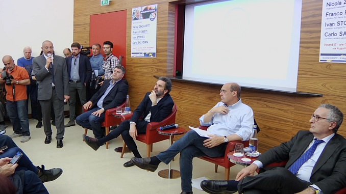 Nel capoluogo ogni leader lancia la volata ai candidati della propria coalizione: nell’hotel Risorgimento, al fianco di Zingaretti, ci sono il candidato sindaco di Lecce Carlo Salvemini e i candidati alle Europee Ivan Stomeo, sindaco di Melpignano, e Franco Roberti, capolista nella circoscrizione Sud.