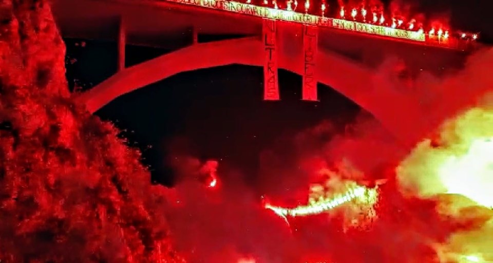LECCE – Nel cuore della notte il buio si colora di giallorosso, più rosso che giallo, e si scatena l’inferno di fumo sul ponte del Ciolo a Gagliano del Capo, dove il mare si insinua prepotentemente tra la scogliera.