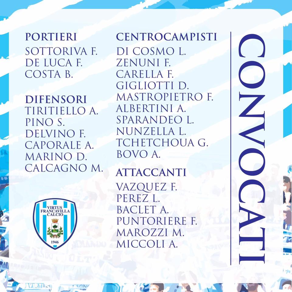 FRANCAVILLA FONTANA – Bruno Trocini, che in panchina non ci sarà perché squalificato, al suo posto Maximiliano Ginobili, ha convocato 25 calciatori per la sfida casalinga contro la Casertana di domenica 8 settembre 2019 con fischio d’inizio alle ore 16.30, valida per la terza giornata del Campionato Nazionale di Serie C girone C 2019/2020 allo Stadio Giovanni Paolo II di Francavilla Fontana.