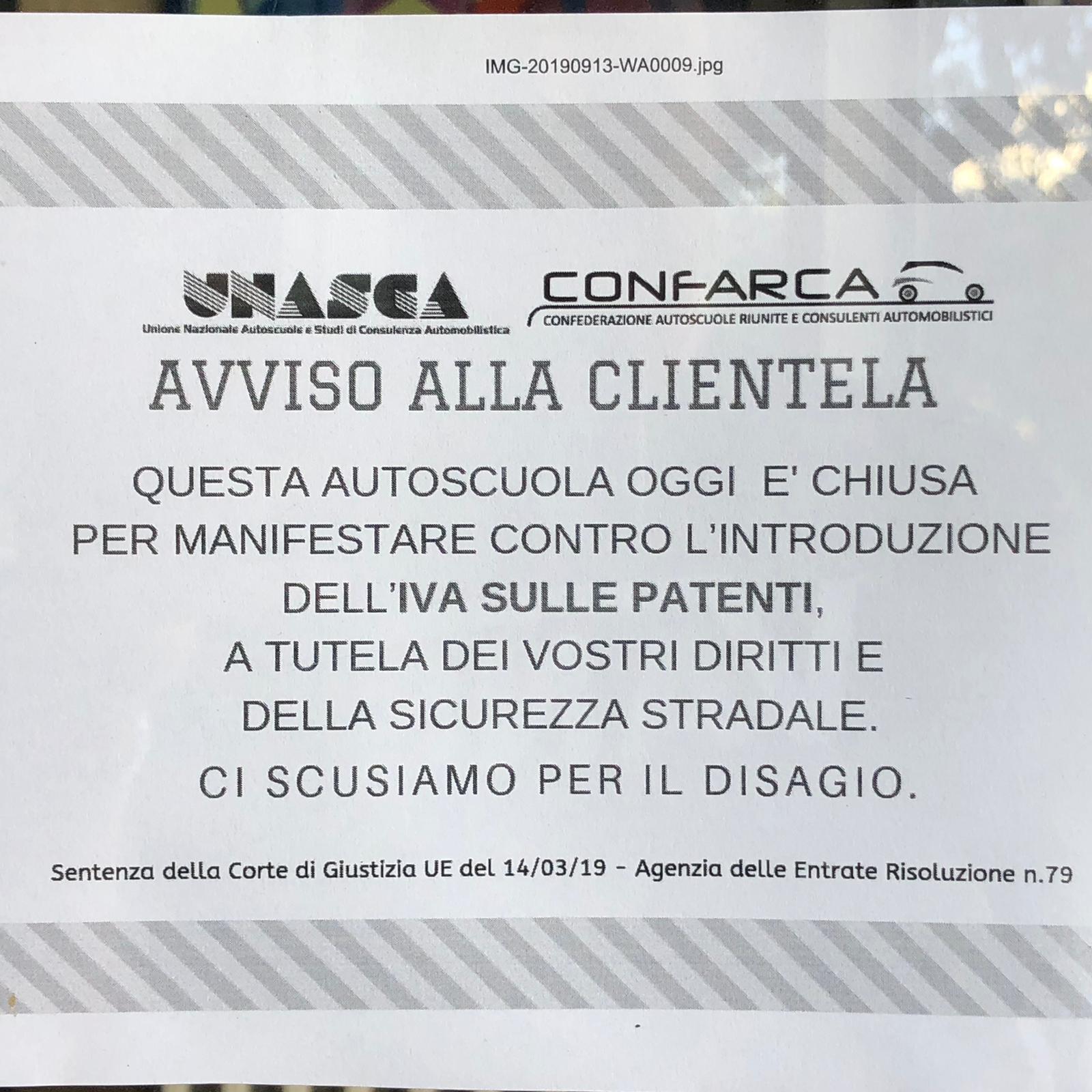 LECCE- Una dopo l’altra, tutte chiuse, “a tutela dei vostri diritti e della sicurezza stradale”. Recita così il cartello affisso in diverse autoscuole della città e della provincia. E’ il giorno della loro serrata, in segno di protesta contro il rincaro sulle patenti introdotto con la risoluzione dell’Agenzia delle Entrate del 2 settembre scorso: per la prima volta, si impone l’applicazione dell’Iva al 22 per cento sul prezzo della patente. Il che significa che, a fronte di un costo medio di 700 euro per il corso teorico e pratico, ci sarebbe un sovraccarico di 150-200 euro.