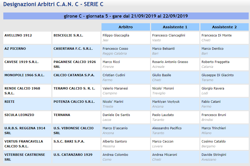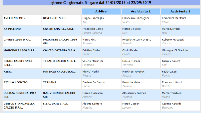 Di seguito il quadro completo delle designazioni arbitrali della 5^ giornata del Girone C: