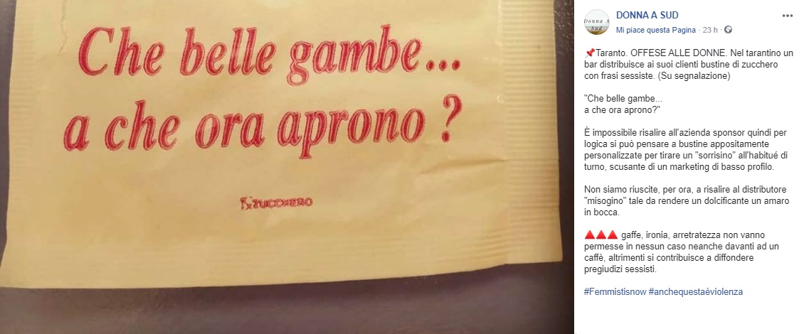 TARANTO- Quando prendere un caffè diventa una provocazione. Accade in un bar, probabilmente di Taranto, da cui è partita una polemica abbastanza accesa per delle particolari bustine di zucchero. A sollevare il polverone ci ha pensato il post pubblicato su Facebook dalla pagina “Donna a Sud”, in cui si può notare una bustina con su scritto: “Che belle gambe…a che ora aprono?”