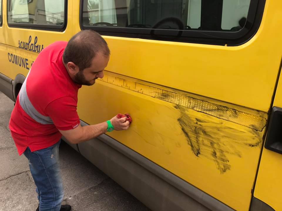 Scuolabus imbrattati, autista e sindaco li ripuliscono