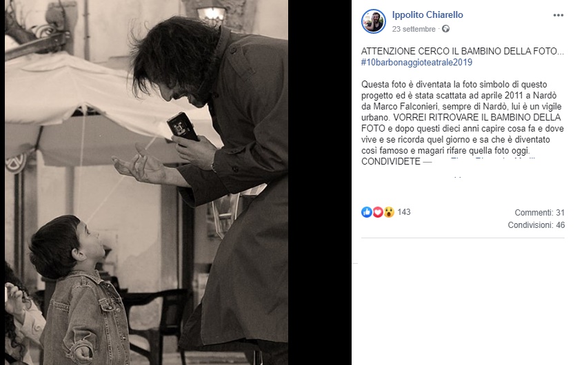 LECCE- Pubblica un annuncio su Facebook e nel giro di poco tempo trova chi stava cercando: Alberto. E’ accaduto a un artista leccese, Ippolito Chiarello, che nel 2010 aveva scattato una foto con un bimbo di appena due anni: “Questa immagine -si leggeva nel suo post- è diventata la foto simbolo di questo progetto, il “Barbonaggio teatrale” , ed è stata scattata a Nardò da Marco Falconieri, un vigile urbano. VORREI RITROVARE IL BAMBINO DELLA FOTO e dopo questi dieci anni capire cosa fa e dove vive e se ricorda quel giorno e sa che è diventato così famoso e magari rifare quella foto oggi”.