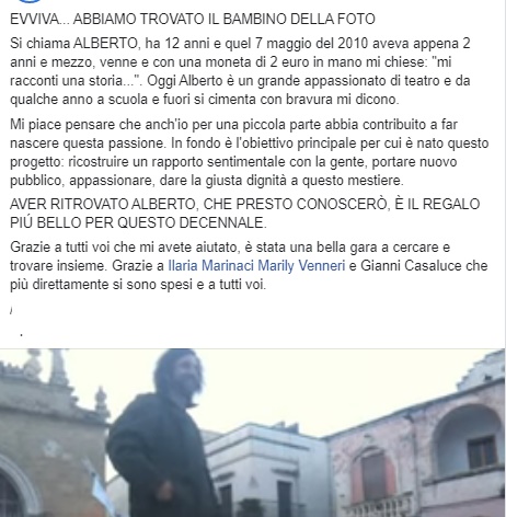 Un post questo che ha fatto il giro del web, mobilitando amici e conoscenti e alla fine è arrivata la bella notizia: “ABBIAMO TROVATO IL BAMBINO DELLA FOTO. Si chiama ALBERTO -scrive in un nuovo post su Facebook- ha 12 anni e quel 7 maggio del 2010 aveva appena 2 anni e mezzo, venne e con una moneta di 2 euro in mano mi chiese: “mi racconti una storia…”. Oggi Alberto è un grande appassionato di teatro e da qualche anno a scuola e fuori si cimenta con bravura mi dicono. Mi piace pensare –continua Ippolito– che anch’io per una piccola parte abbia contribuito a far nascere questa passione. In fondo è l’obiettivo principale per cui è nato questo progetto: ricostruire un rapporto sentimentale con la gente, portare nuovo pubblico, appassionare, dare la giusta dignità a questo mestiere. AVER RITROVATO ALBERTO -conclude- CHE PRESTO CONOSCERÒ, È IL REGALO PIÚ BELLO PER QUESTO DECENNALE”.