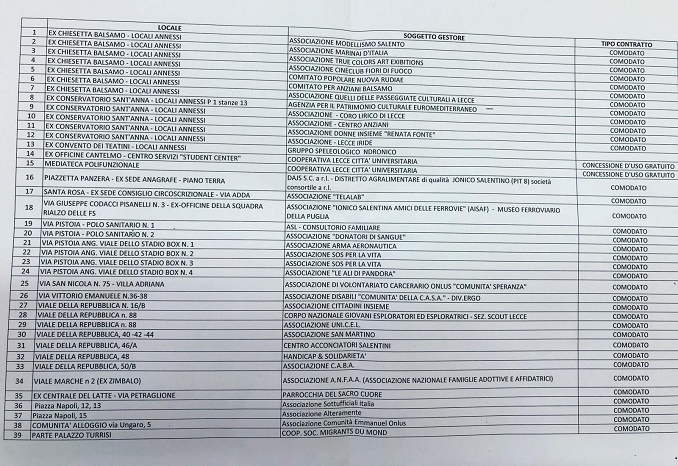 LECCE- Sono 39 gli immobili di proprietà del Comune di Lecce assegnati in comodato gratuito alle associazioni. L’85 per cento di queste concessioni, però, è scaduto da tempo e il restante 15 per cento è prossimo ad esserlo. È il dato più importante emerso durante la seduta della commissione controllo, convocata in mattinata a Palazzo Carafa, su richiesta del consigliere Giorgio Pala, incalzato da diverse organizzazioni di volontariato. A parlare sono stati il dirigente del Settore Patrimonio, Parlangeli, ed il funzionario incaricato, Goffredo: hanno fornito l’elenco, che vedete, dei locali comunali assegnati in comodato gratuito, escludendo altri immobili concessi in affitto oppure occupati dal Comune o in attesa di stabilire la destinazione d’uso.