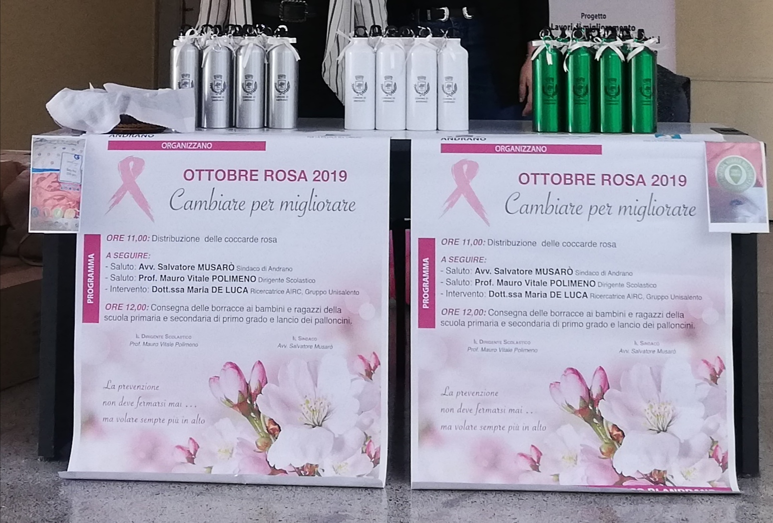 ANDRANO- Anche il Comune di Andrano intende diventare plastic-free: in mattinata, l’amministrazione ha distribuito le borracce in alluminio agli studenti dell’istituto comprensivo, per ridurre il consumo di bottigliette usa e getta. L’evento rientra nella campagna “Ottobre rosa 2019”, mese dedicato alla prevenzione e ha visto la collaborazione dell’Istituto Comprensivo di Diso e di AIRC – Fondazione per la Ricerca sul Cancro, che con la ricercatrice Maria De Luca ha tenuto una relazione sul tema della prevenzione nella didattica scolastica.