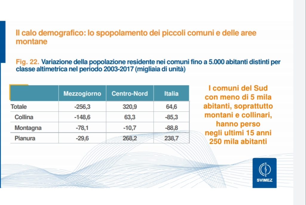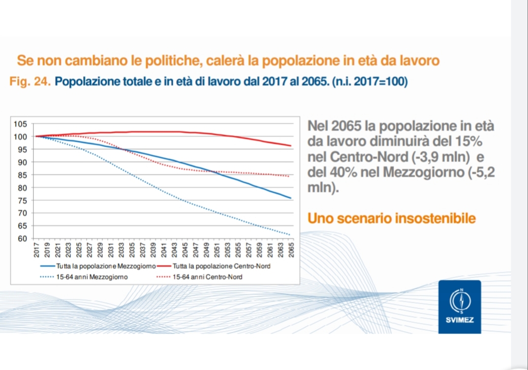 Se non si cambia rotta, «nel 2065 la popolazione in età da lavoro diminuirà del 15% nel Centro-Nord (-3,9 milioni) e del 40% nel Mezzogiorno (-5,2 milioni)», terra che continuerà a spopolarsi. Il calo demografico riguarda soprattutto i comuni sotto i 5mila abitanti. Negli ultimi 15 anni, quelli del Sud hanno perso ben 250mila abitanti.
