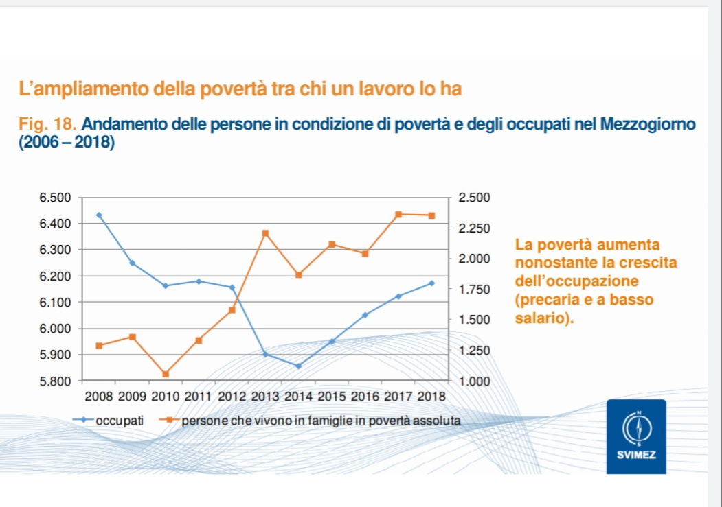 A ciò si aggiungono i dati economici impietosi: il Mezzogiorno è in recessione, con un Pil stimato in calo dello 0,2 per cento, a fronte del +0,3 per cento del Centro-Nord (+0,2% la media nazionale). Per il 2020 si stima una «debole ripresa»: con il Mezzogiorno che crescerà non oltre lo 0,2% (a fronte dello 0,6% dell’Italia nel complesso).