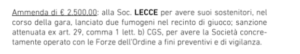 Inoltre il dott. Mastrandrea tra le varie ammende ha sanzionato anche l’US Lecce con € 2500,00 perché durante la gara con il Sassuolo sono stati lanciati due fumogeni nel recinto di gioco.