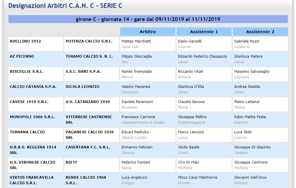 Di seguito tutti gli arbitri del Girone C per il 14° turno: