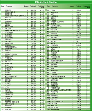 E se la provincia autonoma di Trento rappresenta l’eccellenza, l’ultimo posto è per Agrigento, “caso paradigmatico di realtà del Sud con problemi strutturali atavici irrisolti, figura nell’ultimo posto della classifica, quest’anno relativa a 107 province, non più a 110 (quelle sarde si sono ridotte da otto a cinque)” viene spiegato da ItaliaOggi.