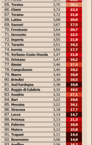 Sul podio Trieste al primo posto, seguita da Aosta e Parma. In fondo alla classifica Agrigento, la Bat al penultimo posto, Crotone all’ultimo.