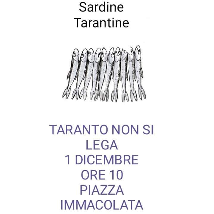 Il gruppo “Sardine tarantine”, invece, ha già lanciato la prima adunanza: il 1° dicembre in piazza Immacolata. Dopo i flash-mob anti-sovranisti che si sono tenuti nei giorni scorsi in Emilia Romagna, in concomitanza con i comizi del leader della Lega, dunque, è mobilitazione nelle altre regioni, come Lazio, Toscana e, appunto, la Puglia.
