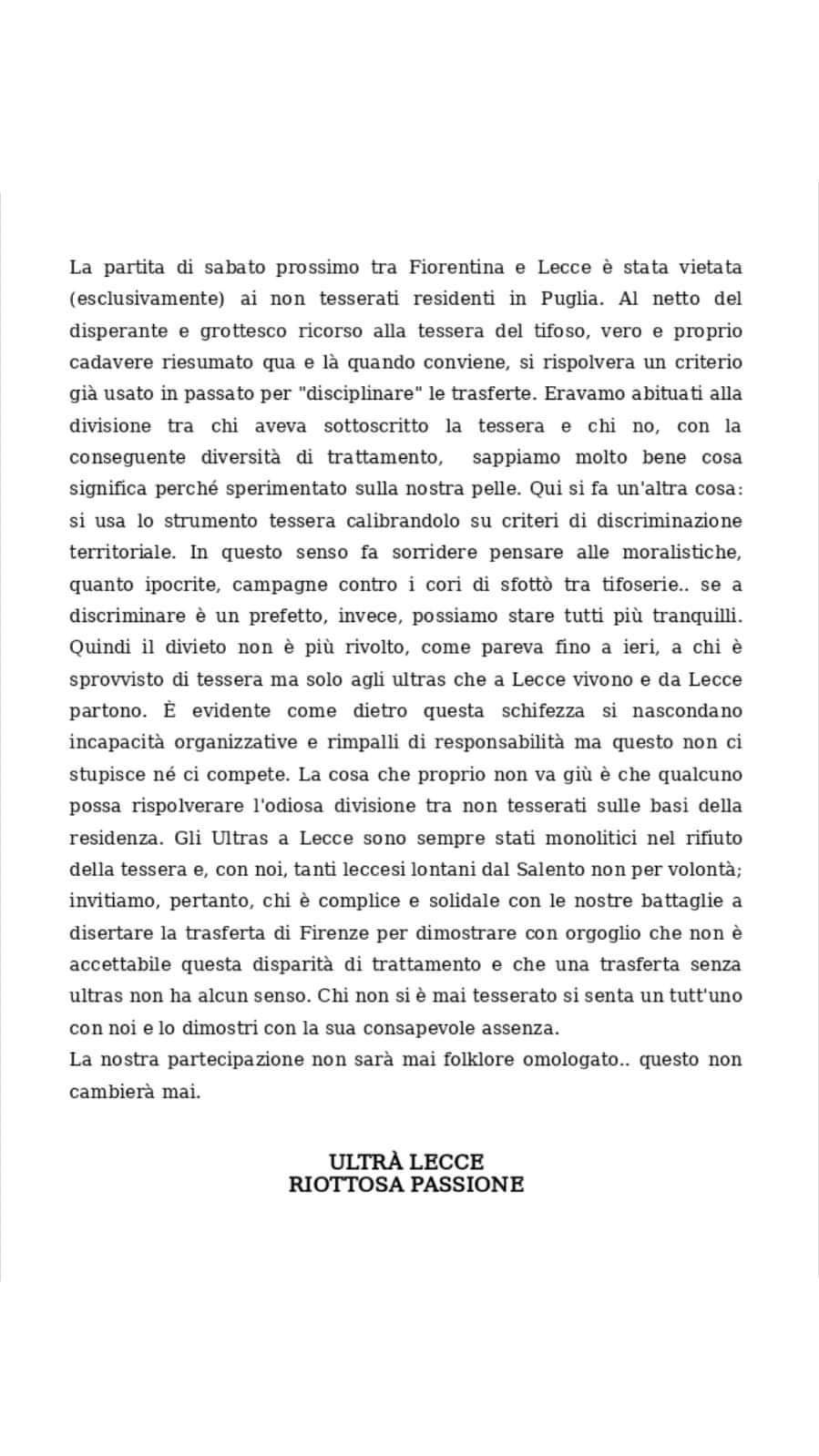 Di seguito la lettera degli Ultras Lecce che sta facendo il giro del web.