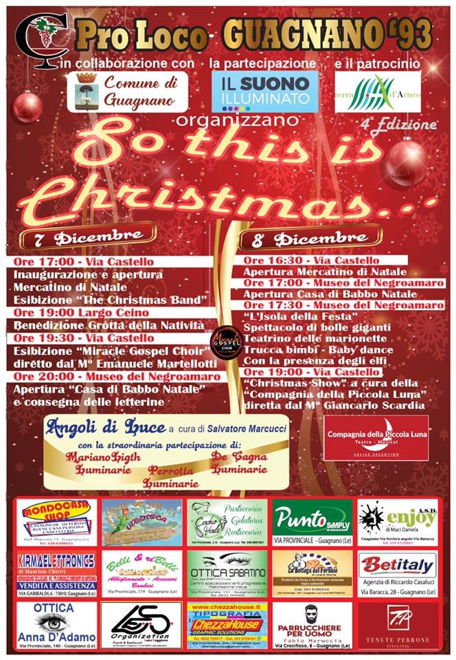 Il centro storico di Guagnano si veste a festa ed ospita, per il quarto anno consecutivo, “So this is Christmas”, l’evento natalizio più atteso del Nord Salento, ideato e promosso dai volontari della Pro Loco Guagnano ’93 in collaborazione con il Comune di Guagnano, con la partecipazione del progetto “Il suono illuminato” e il patrocinio del Gal Terra d’Arneo.