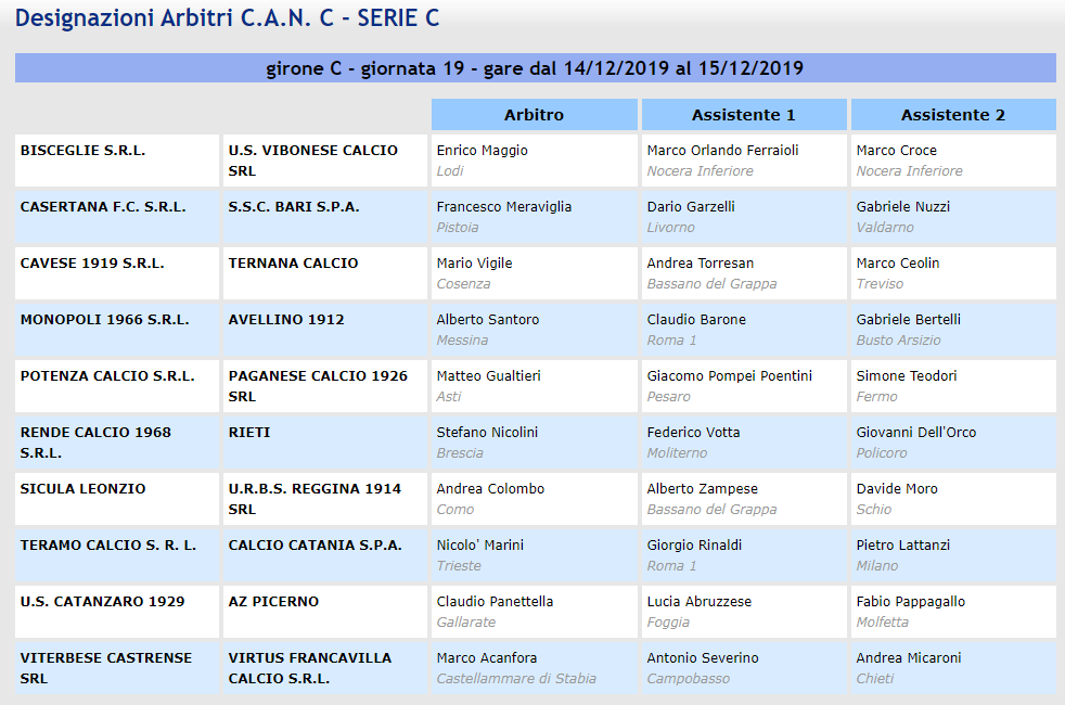 Di seguito tutte le designazioni per la 19^ giornata del Girone C.