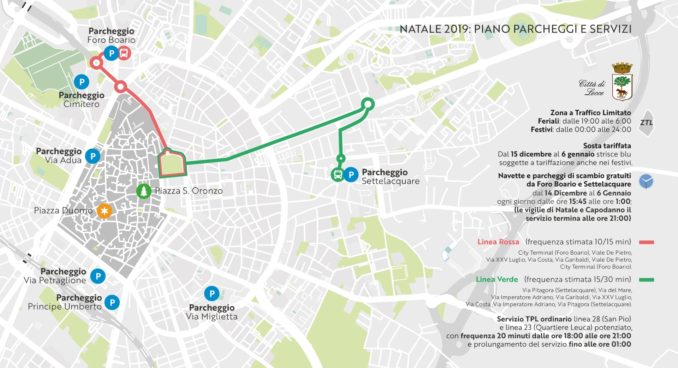 Il servizio gratuito di parcheggio e navetta sarà a disposizione dei cittadini fino al 6 gennaio. Inizia alle 15:45 e termina all’ 01:00. Nei giorni 24 e 31 dicembre 2019 il servizio terminerà alle 21.00. Dal Foro Boario partirà verso il centro città la Linea Rossa, con frequenza 10-15 minuti. Da Settelacquare partirà la Linea Verde, con frequenza 15-30 minuti. Le navette gratuite saranno animate da piccoli spettacoli. In questo primo weekend intrattenimento acustico con il cantautore Maurizio Lorio a bordo della navetta di Settelacquare. Raffaele Albanese e Babbo Natale saranno sulle linee da Settelacquare e dal Foro Boario