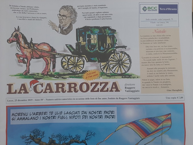 LECCE- 50 anni di Carrozza il giornale satirico dei leccesi diretto da Ruggero Vantaggiato. 100 numeri, a Natale e S. Oronzo dove nelle pagine si trovano i volti, i vizi, le abitudini dei leccesi, con i personaggi ritratti nelle famose vignette in scena di vita quotidiana, oppure ad impersonare personaggi del passato o della fantasia.