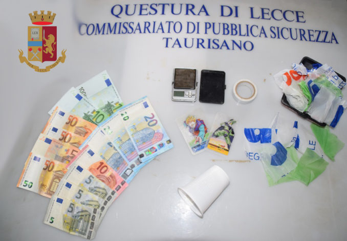 TAURISANO- Gli agenti del Commissariato di Taurisano hanno posto sotto osservazione l’abitazione di Ennio DE PATRE, vecchia conoscenza delle forze dell’ordine, 55enne di Presicce-Acquarica, avendo constatato che in alcune ore della giornata, soprattutto la mattina, c’era un continuo andirivieni di giovani. Gli investigatori hanno fatto irruzione. Nel corso della perquisizione sono stati trovati in camera da letto circa 40 grammi di cocaina. Una parte della cocaina era in un bicchiere di plastica e l’altra in un piatto di porcellana. Trovato anche un bilancino di precisione perfettamente funzionante, un cofanetto porta sigarette contenente numerosissimi pezzi in cellophane di vario colore utili per il confezionamento delle dosi, un nastro adesivo utilizzato per sigillare le dosi da vendere e la somma di euro 485,00 in banconote di diverso taglio. L’uomo è stato tratto arrestato per detenzione di sostanza stupefacente ai fini di spaccio.