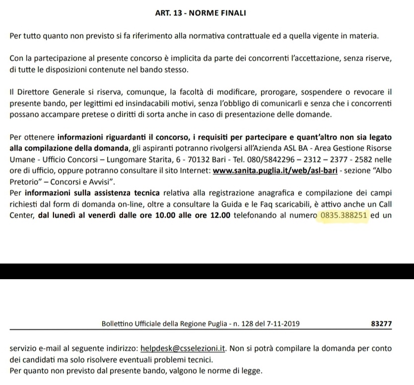 Infatti nell’articolo 13 del citato bando viene scritto che “qualora servissero informazioni tecniche relative alla registrazione anagrafica e compilazione dei campi richiesti dal form di domanda on line, si poteva contattare il numero call center 0835-388251”. Peccato però che malgrando la diretta interessata abbia iniziato a chiamare dal 28 dicembre, sentendosi continuamente dire dall’altra parte della cornetta “di restare in attesa per non perdere la priorità”, solo nella giornata del 13 gennaio una voce ha finalmente risposto dicendo però che il numero digitato era sbagliato per motivi di trasferimento e che si doveva contattare un altro numero telefonico. “E’ mai possibile che un bando pubblicato sulla Gazzetta Ufficiale a cui cercano di accendere in tanti possa contenere una simile inesattezza e che nessuno abbia provveduto a informarci sul nuovo recapito? -si domanda la signora- per due settimane quindi ho solo perso tempo e come me sicuramente moltissimi altri”. Quindi, per chi fosse ancora interessato, da ora fino alla scadenza del bando, prevista per il prossimo 26 gennaio, potrà telefonare al numero esatto 0835- 331493 .