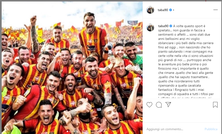 “A volte questo sport è spietato… non guarda in faccia a sentimenti o affetti .. sono stati due anni bellissimi anzi mi voglio sbilanciare i più belli della mia carriera fino ad oggi – scrive il Taba – non nascondo che ho pianto salutando i miei compagni ma certe volte nella vita ci sono situazioni più grandi di noi; purtroppo anche le avventure più belle prima o poi finiscono ma l’importante è quello che rimane, quello che lasci alla gente, quello che hai saputo trasmettere, quello che ricorderanno tutti ripensando a quella cavalcata fantastica! Ringrazio tutti i miei compagni di squadra e tutti i tifosi per l’affetto che mi avete dimostrato, mi sono arrivati non so quanti messaggi non riuscirò a leggerli tutti ma vi ringrazio davvero con tutto il cuore! – conclude Andrea – Ora inizia una nuova avventura e ringrazio il Frosinone calcio per la fiducia riposta in me e spero di ripagarla subito sul campo!”.