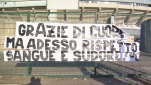 La tifoseria più calda, con uno striscione esposto davanti ad uno degli ingressi dello stadio, ha invitato la squadra a dare il massimo. “Lo striscione è stimolante – conclude -, anche i tifosi fanno sacrifici per la squadra, ma posso garantire che i miei giocatori lavorano al massimo. Quello che chiedo è rimanere uniti fino all’ultimo”