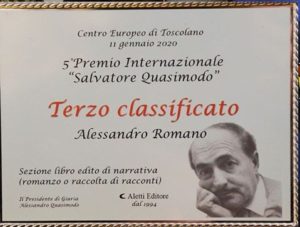 La giuria era presieduta dal figlio del grande poeta ed era composta anche da Mogol e dall’editore Aletti che ha indetto il premio. Il lavoro di Romano è stato riconosciuto meritevole dell’ambito riconoscimento nella sezione “Libro edito di narrativa”, nell’ambito delle celebrazioni del 60esimo anniversario del Premio Nobel per Quasimodo.