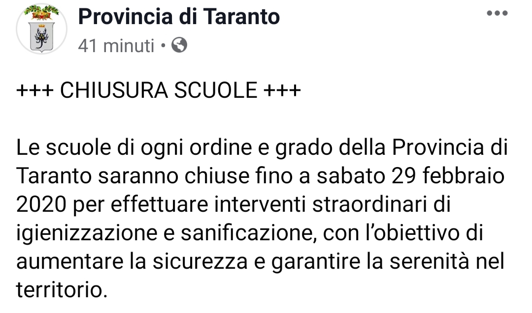 “Le scuole di ogni ordine e grado della Provincia di Taranto saranno chiuse fino a sabato 29 febbraio 2020 per effettuare interventi straordinari di igienizzazione e sanificazione, con l’obiettivo di aumentare la sicurezza e garantire la serenità nel territorio”.