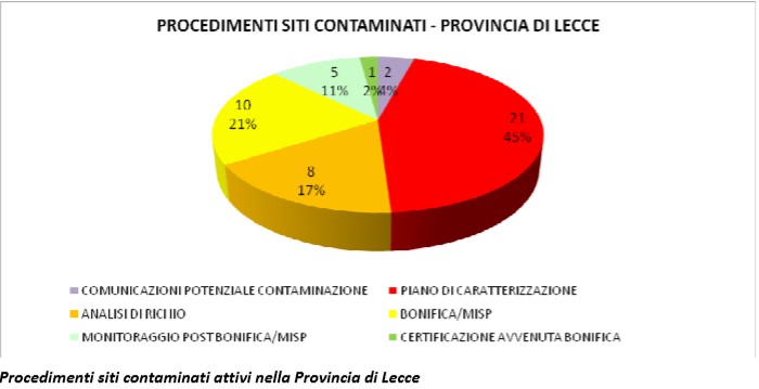 Relativamente a quei 107 siti contaminati del Leccese, al momento sono in corso solo 47 procedimenti amministrativi volti alla bonifica, giunti a differenti fasi dell’iter. In quasi la metà dei casi (21 su 47) si è ancora fermi alla fase del piano di caratterizzazione, mentre la certificazione dell’avvenuta bonifica riguarda una sola discarica e il procedimento di bonifica è in corso per dieci siti.