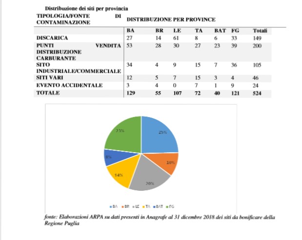 L’aggiornamento su questo fronte è a dicembre 2018: sono 524 in totale i siti contaminati in Puglia, almeno quelli noti. La gran parte sono punti vendita di distribuzione del carburante o aree industriali, ma a farla da padrona, nella provincia di Lecce molto più che altrove, sono le discariche di rifiuti: ben 61, quasi la metà del totale di tutta la regione. Seguono 30 distributori di benzina da bonificare, nove siti industriali o commerciali e sette di altro dipo.