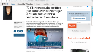 LECCE – Lo ha confermato il Ministero della Salute spagnolo: un giornalista spagnolo presente a Milano il 19 febbraio per assistere alla gara Atalanta – Valencia è risultato positivo al Coronavirus, prima di arrivare alla stadio di San Siro era stato anche a Pisa. Lo ha riferito il giornale spagnolo El Mundo.