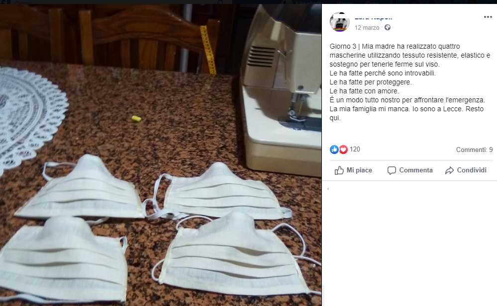 Sarte all’opera anche a Palmariggi, dove (attraverso la Fondazione Azzurro Park onlus-Lu Paniri te e site-Protezione Civile-Quattro Ventri-Pro Loco Montevergine-Mons Jovis-Frates-Anteas-Famiglia di famiglie-Coro Parrocchiale), in questi giorni stanno realizzando centinaia di mascherine da consegnare in tutte le famiglie gratuitamente, così come sta facendo una farmacia Corigliano d’Otranto che ha deciso di regalare le mascherine, commissionate alla sua sarta di fiducia -che non ha voluto essere pagata-, ai suoi clienti.