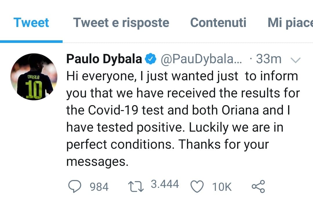 Paolo Dybala positivo al tampone, ad annunciarlo la società bianconera dal suo sito ufficiale, il calciatore sta bene ed è asintomatico.