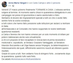 SALENTO- “Venerdì 27 marzo potremo finalmente TORNARE A CASA. L’odissea sembra volgere al termine”. Lo annuncia dal suo profilo Facebook Anna Maria Vergari, la salentina bloccata con il suo compagno, in quarantena obbligatoria, in una campeggio in Grecia, nei pressi di Igoumenitza.