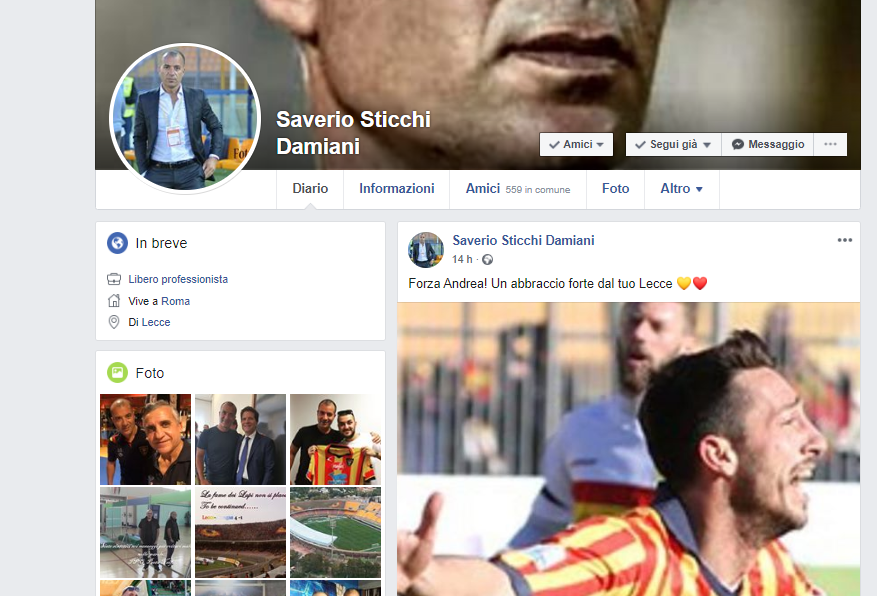 Non appena questa notizia è stata resa nota, dal club di Via Col. Costadura sono subito arrivati gli abbracci, virtuali del Presidente Saverio Sticchi Damiani che dai suoi canali social ha scritto “Forza Andrea! Un abbraccio forte dal tuo Lecce” seguito da due cuore giallorossi e dell’intera società con un messaggio semplice, forte, chiaro colorato da un cuore: “Forza Andrea Saraniti vinci anche questa! La famiglia giallorossa è al tuo fianco! Siamo tutti con te” .