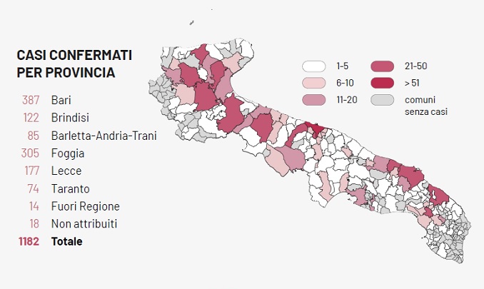 Un trend da due giorni costante, si diceva, ma che nelle ultime 24 ore ha registrato un primo picco di decessi: ben 17. Uno nel Leccese (77enne), 6 in provincia di Brindisi (dai 54 agli 82 anni), 8 in provincia di Foggia (dai 57 ai 92 anni) , 2 in provincia di Bari (di 92 e 74 anni).