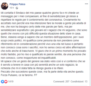 Mi spiace che un gesto del genere sia stato visto così e vi confermo che se è servito a tenere in casa con più serenità anche un solo ragazzo, la richiesta che mi è stata fatta la ritengo giusta e la rifarei. Peccato che succedono queste cose, ma fa parte della vita anche questo. Forza Pulsano, ce la faremo”.