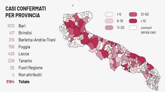 Nell’amara classifica dei contagi al primo posto restano Bari e provincia con 1.013 casi, segue il Foggiano con 756 casi, subito dopo c’è il Leccese con 426 soggetti positivi, seguito dal Brindisino con 417 casi. Ci sono poi la Bat (315 infetti) e, ultima, la provincia di Taranto (228 casi).
