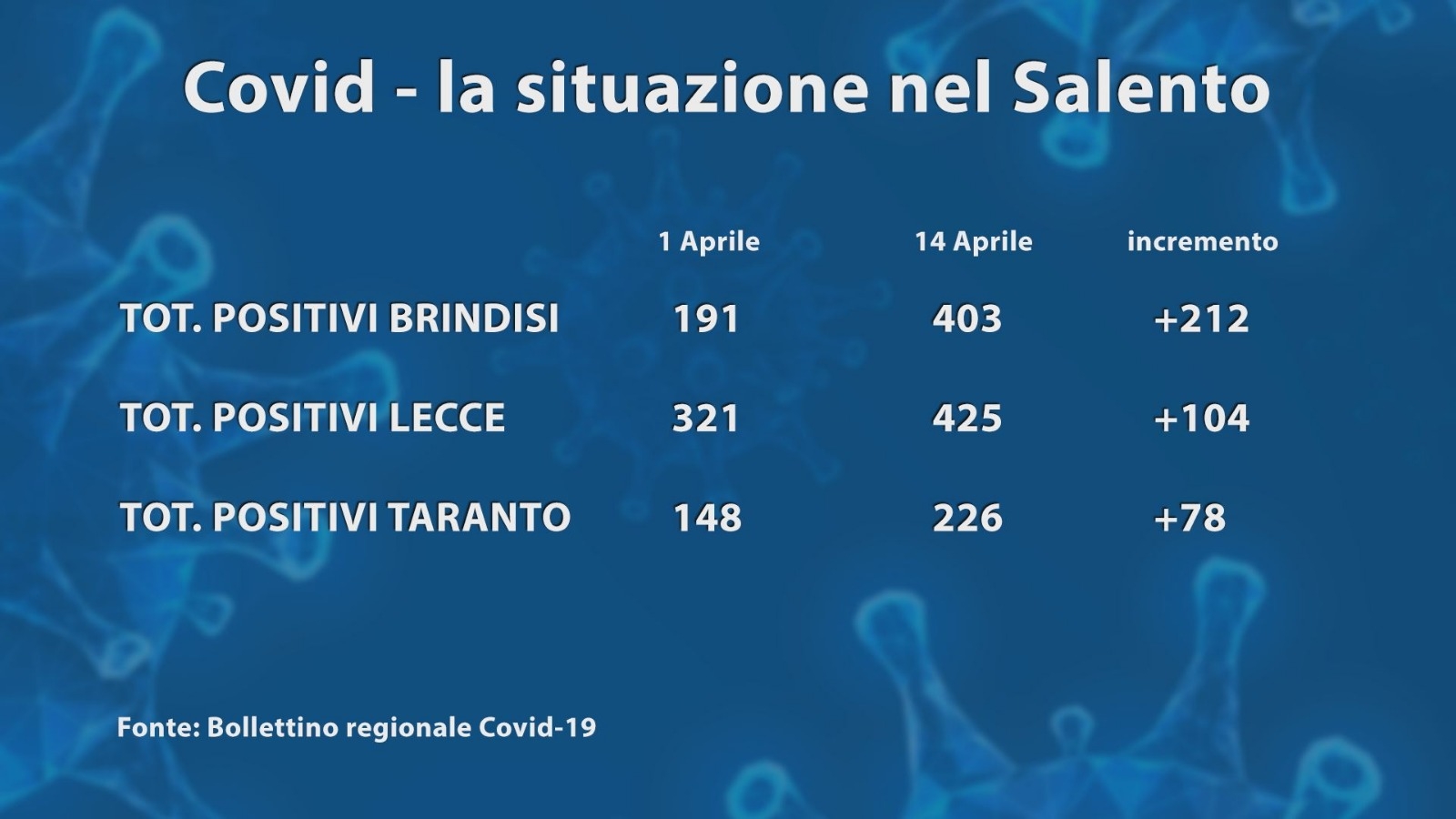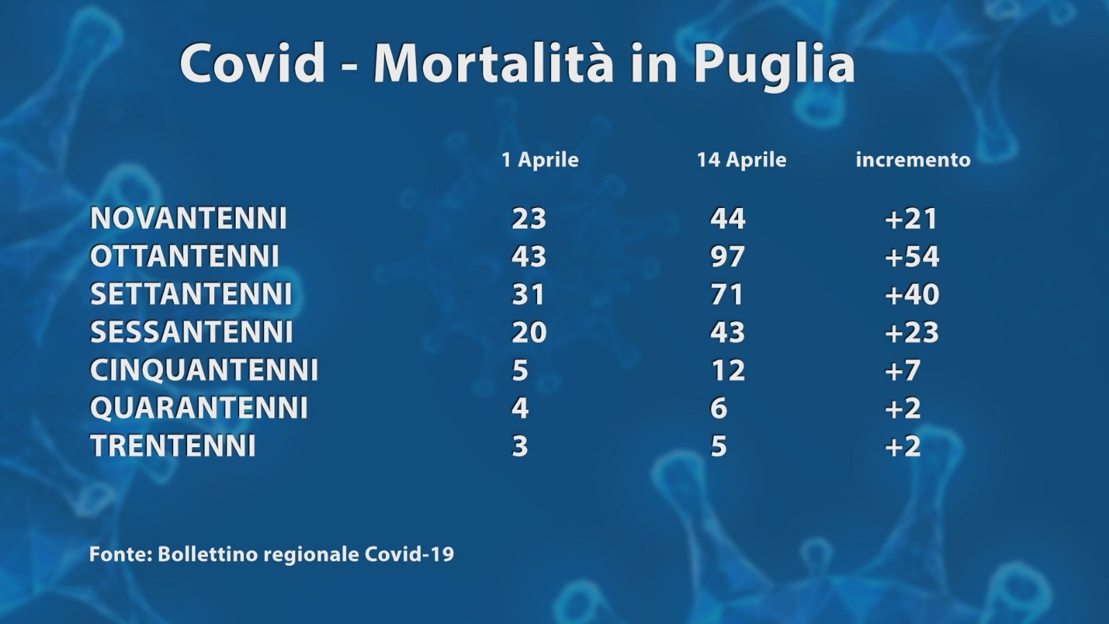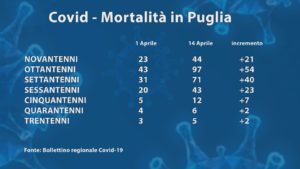 I decessi, per quanto prevedibili, restano cospicui: nel Leccese, se ne sono registrati 52 come confermato dal Dipartimento di prevenzione Asl. Ma la Puglia, con i suoi 278 deceduti, è la prima regione del Sud per lutti, davanti alla Campania che ne conta 260 a fronte però di 600 positivi in più. E’ stata finora strage di anziani: in due settimane, si è passati da 23 a 44 novantenni deceduti, da 43 a 97 ottantenni, da 31 a 71 settantenni che non ce l’anno fatta. Ma anche da 20 a 43 sessantenni, da 5 a 12 cinquantenni, da 4 a 6 quarantenni, da 3 a 5 trentenni.