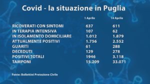 La lettura dei bollettini della Protezione civile documenta che tra il 1° e il 14 aprile in Puglia si sono registrati meno ricoveri, passati da 637 a 611, con un alleggerimento significativo delle terapie intensive, dove i posti occupati sono scesi da 107 a 62. Incrementate di oltre 800 unità le persone in isolamento domiciliare e sono aumentati a ritmo più incalzante i guariti rispetto ai deceduti.