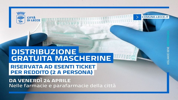 LECCE – Partirà da venerdì 24 aprile nelle farmacie e parafarmacie di Lecce la distribuzione gratuita delle 25mila mascherine chirurgiche donate alla città di Lecce dalla comunità cinese lo scorso 15 aprile.