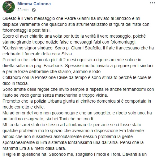 LECCE- Sono passati pochi giorni dai funerali di Silvia  Ghezzi, la ragazza scomparsa dopo aver combattuto due lunghi anni contro alcune patologie rare. Un ultimo saluto quello di domenica, che come se non bastasse, oltre al dolore è stato macchiato da polemiche, che ancora oggi non si placano. Stando a mamma Mimma qualcuno sembra che stia strumentalizzato la figura di Don Gianni, che ha celebrato la messa,  con fotomontaggi e post falsi. A tal proposito, lui stesso ha deciso di intervenire, per chiarire una volta per tutte cosa davvero quel giorno è successo. Lo ha scritto in un lungo post che indirizza proprio al Sindaco Salvemini: