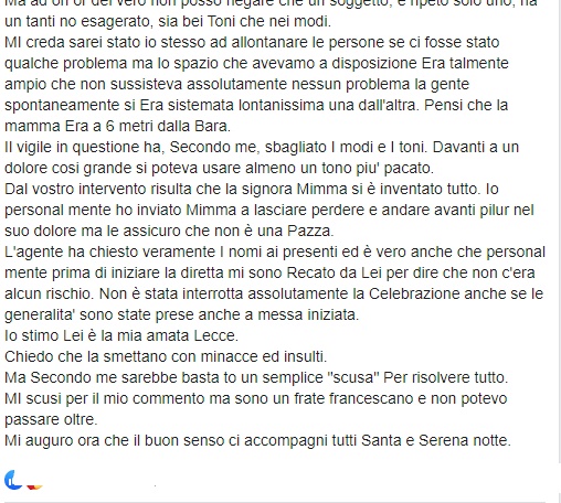 L’agente ha chiesto veramente I nomi ai presenti ed è vero anche che personalmente prima di iniziare la diretta mi sono Recato da Lei per dire che non c’era alcun rischio. Non è stata interrotta assolutamente la Celebrazione anche se le generalità sono state prese anche a messa iniziata. Io stimo Lei è la mia amata Lecce. Chiedo che la smettano -conclude Don Mattia-  con minacce ed insulti. Ma Secondo me sarebbe bastato un semplice “scusa” Per risolvere tutto“.