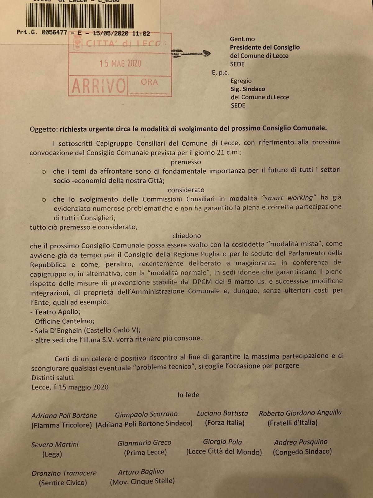 LECCE- In vista  del prossimo Consiglio Comunale previsto per il 21 maggio, l’intera opposizione di Palazzo Carafa (gruppo Poli Bortone- Congedo e M5s) chiede   di svolgerlo  con la cosiddetta “modalità mista”,  o,  in alternativa, con la “modalità normale”, in sedi idonee che garantiscano il pieno rispetto delle misure di prevenzione stabilite dal DPCM del 9 marzo scorso, quali ad esempio: il Teatro Apollo; le Officine Cantelmo; la Sala D’Enghein (Castello Carlo V); o altre sedi che il sindaco vorrà ritenere più consone.
