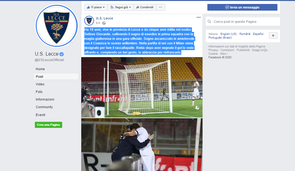 Ha 19 anni, vive in provincia di Lecce e da cinque anni milita nel nostro Settore Giovanile, coltivando il sogno di esordire in prima squadra con la maglia giallorossa in una gara ufficiale. Sogno accarezzato in amichevole con il Cosenza lo scorso settembre. Nella partita di ieri con il Milan viene designato per fare il raccattapalle. Rebic dopo aver segnato il gol lo vede affranto e, compiendo un bel gesto, lo abbraccia per rinfrancarlo.