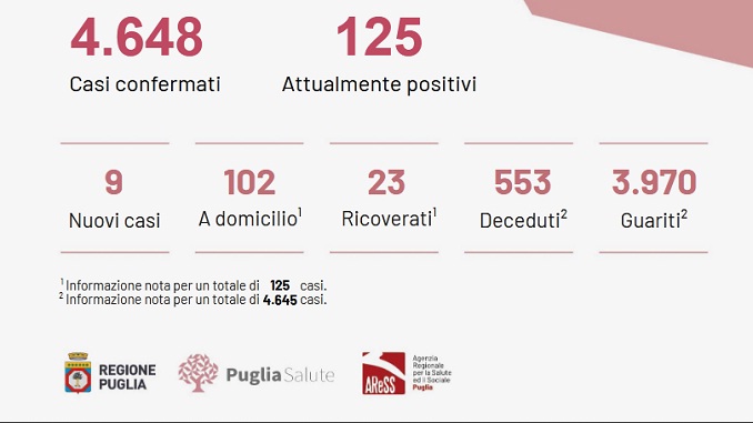 PUGLIA – Oggi in Puglia sono stati registrati  865 test per l’infezione da Covid-19 coronavirus e sono emersi 9 nuovi casi positivi:  5 in  provincia di Lecce, 3 in provincia Bari ; 1 in provincia di Foggia.