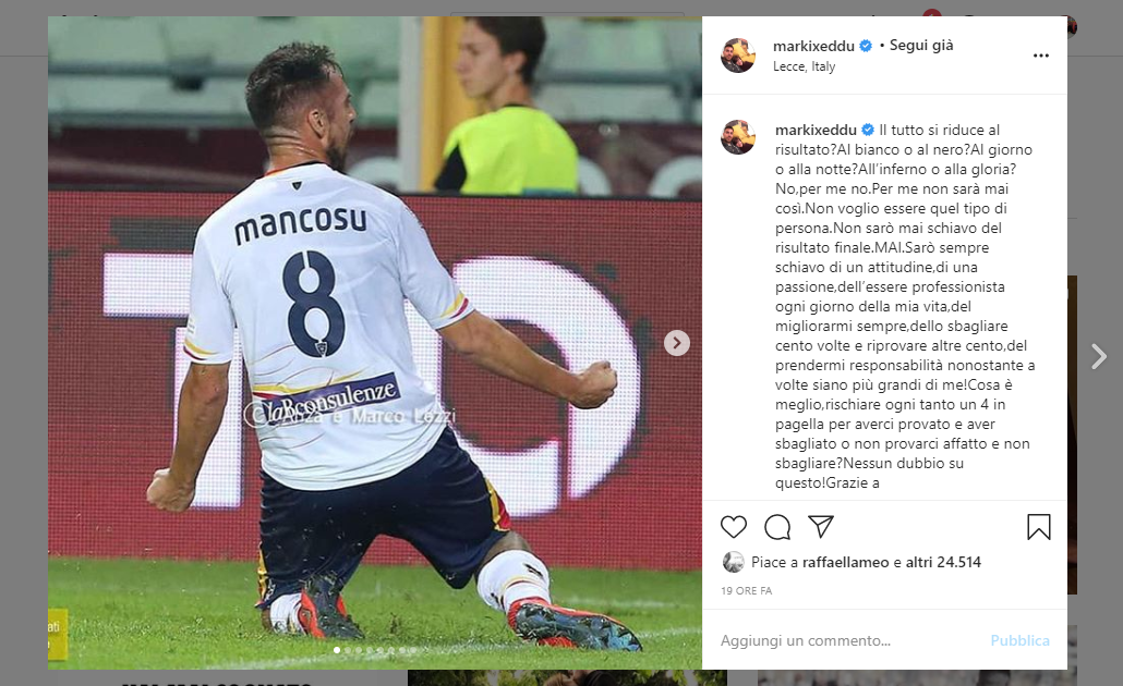 “Il tutto si riduce al risultato?Al bianco o al nero?Al giorno o alla notte?All’inferno o alla gloria?No,per me no. Per me non sarà mai così. – Ha scritto il capitano giallorosso – Non voglio essere quel tipo di persona. Non sarò mai schiavo del risultato finale. Mai. Sarò sempre schiavo di un’attitudine, di una passione, dell’essere professionista ogni giorno della mia vita, del migliorarmi sempre, dello sbagliare cento volte e riprovare altre cento, del prendermi responsabilità nonostante a volte siano più grandi di me! Cosa è meglio,rischiare ogni tanto un 4 in pagella per averci provato e aver sbagliato o non provarci affatto e non sbagliare? Nessun dubbio su questo! – Infine ha concluso così – Grazie a tutti, società, mister, tifosi e compagni di squadra, è stato un anno e soprattutto un viaggio meraviglioso e se retrocessione doveva essere, mi avete fatto vivere la retrocessione più bella della mia vita. Orgoglioso di tutti voi”.
